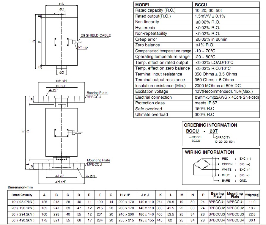 BCCU-50t,BCCU-50t稱重傳感器,Bongshin BCCU-50t傳感器主要特性: