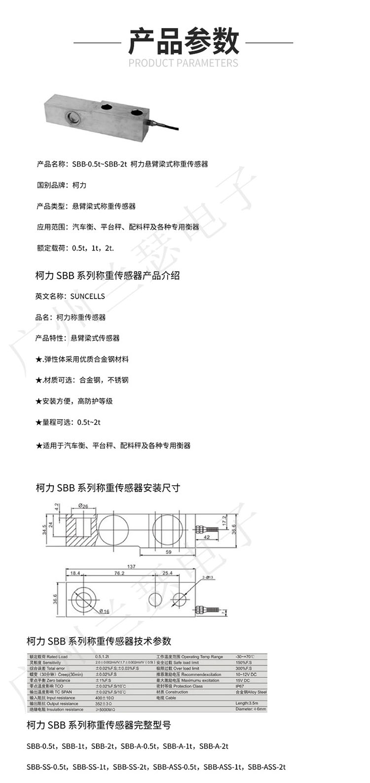 美國(guó)SUNCELLS SBB-3T稱重傳感器中文參數(shù):