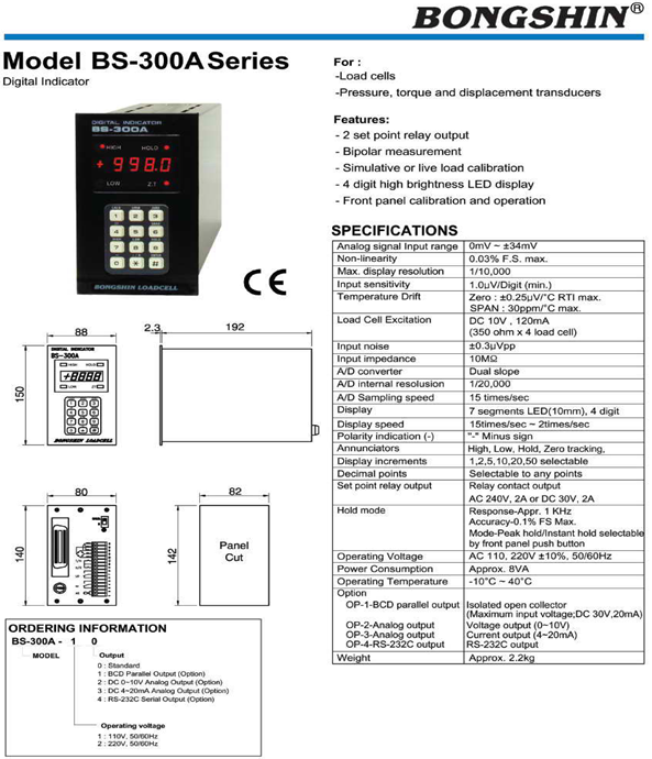 韓國(guó)Bongshin BS-300A稱重儀表技術(shù)指標(biāo)