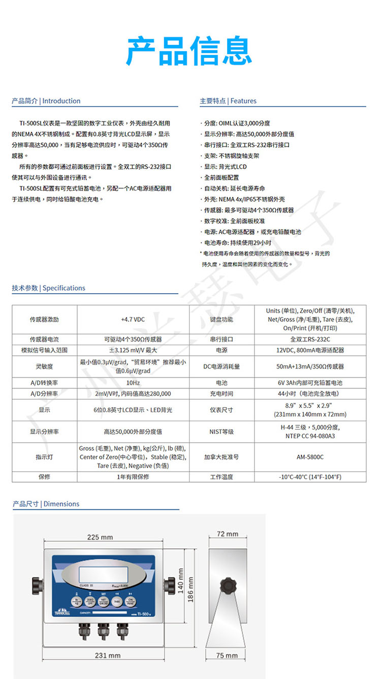 美國Transcell TI-500SL稱重儀表產(chǎn)品參數(shù):