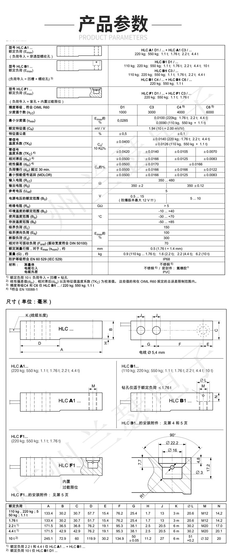 德國HBM HLCF1D1/1.76t稱重傳感器尺寸小防爆型號可選,符合 ATEX95 (HLCF1C3,額定負(fù)載220 kg / 550 kg / 1.1 t / 1.76 t,符合 EMC/ESD認(rèn)證,HBM傳感器按照EN 45 501,符合OIML R60 標(biāo)準(zhǔn),分度最高為3000 d,精度等級D1 / C3。