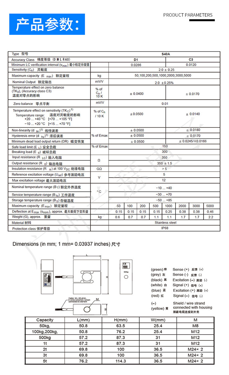 德國HBM S40A稱重傳感器產(chǎn)品參數(shù):