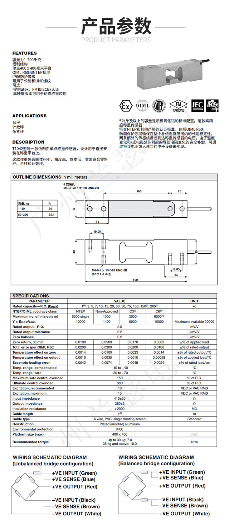 美國Tedea 1042-50kg稱重傳感器產(chǎn)品參數(shù):
