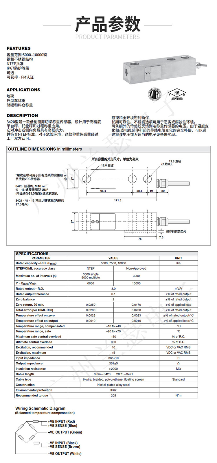 美國Tedea 3420稱重傳感器產(chǎn)品參數(shù):
