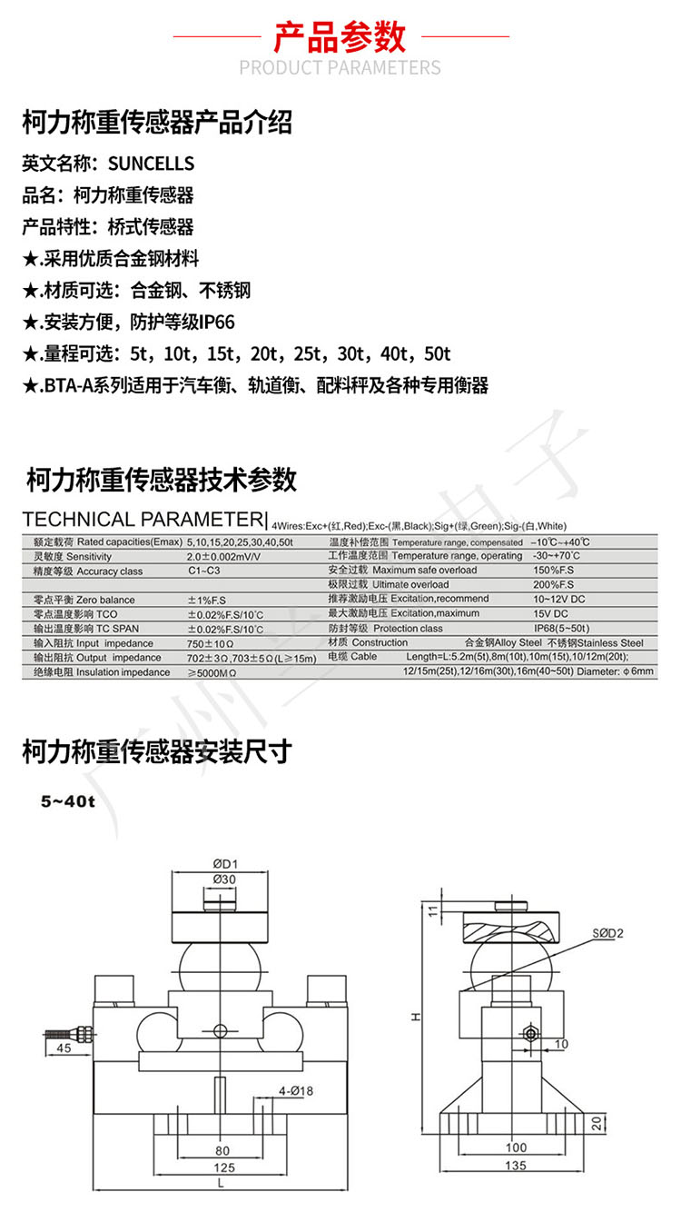 美國SUNCELLS BTA-A-40t,BTA-40t稱重傳感器產(chǎn)品參數(shù):