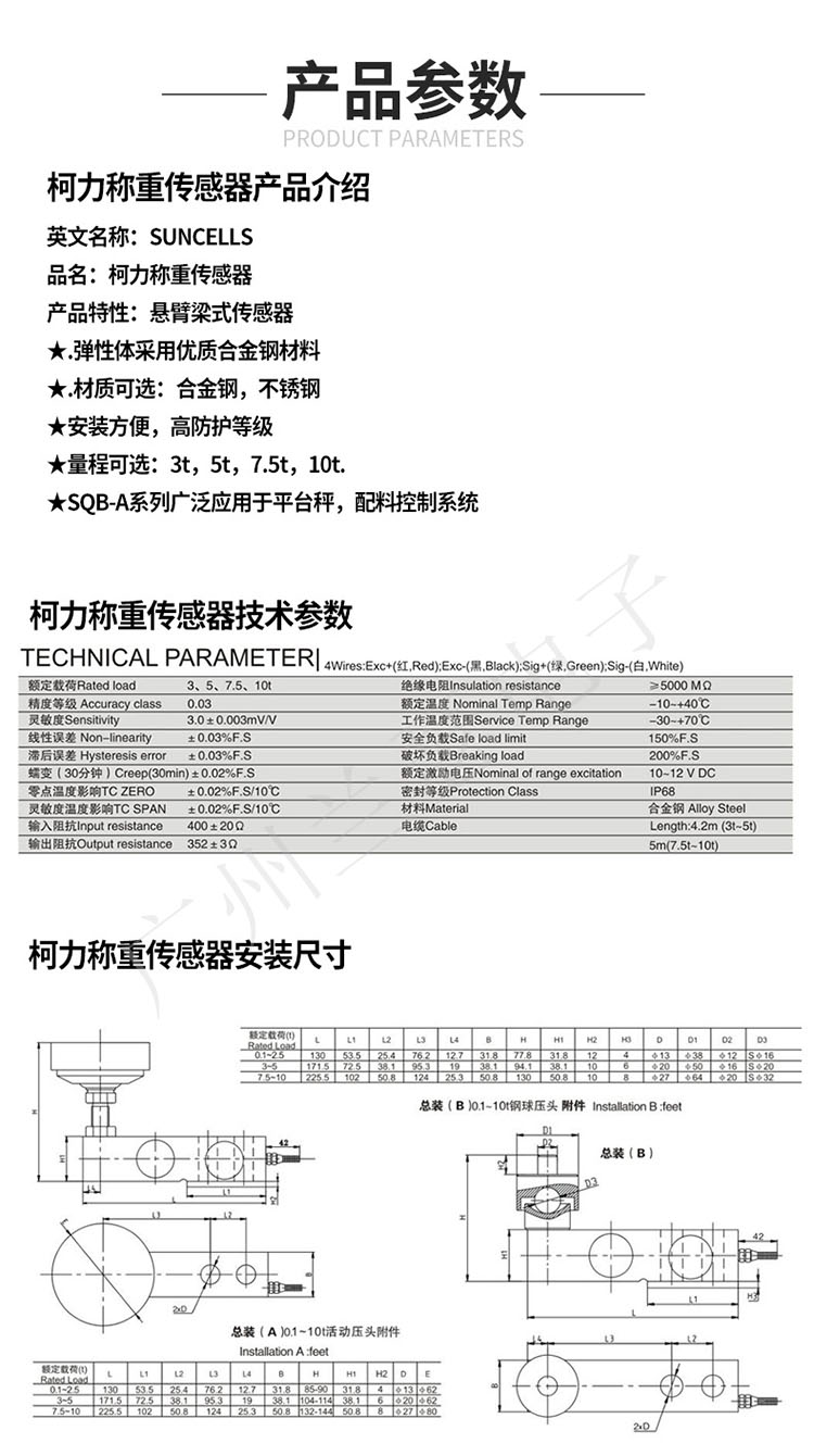 寧波柯力SQB-250KG稱重傳感器產(chǎn)品參數(shù):