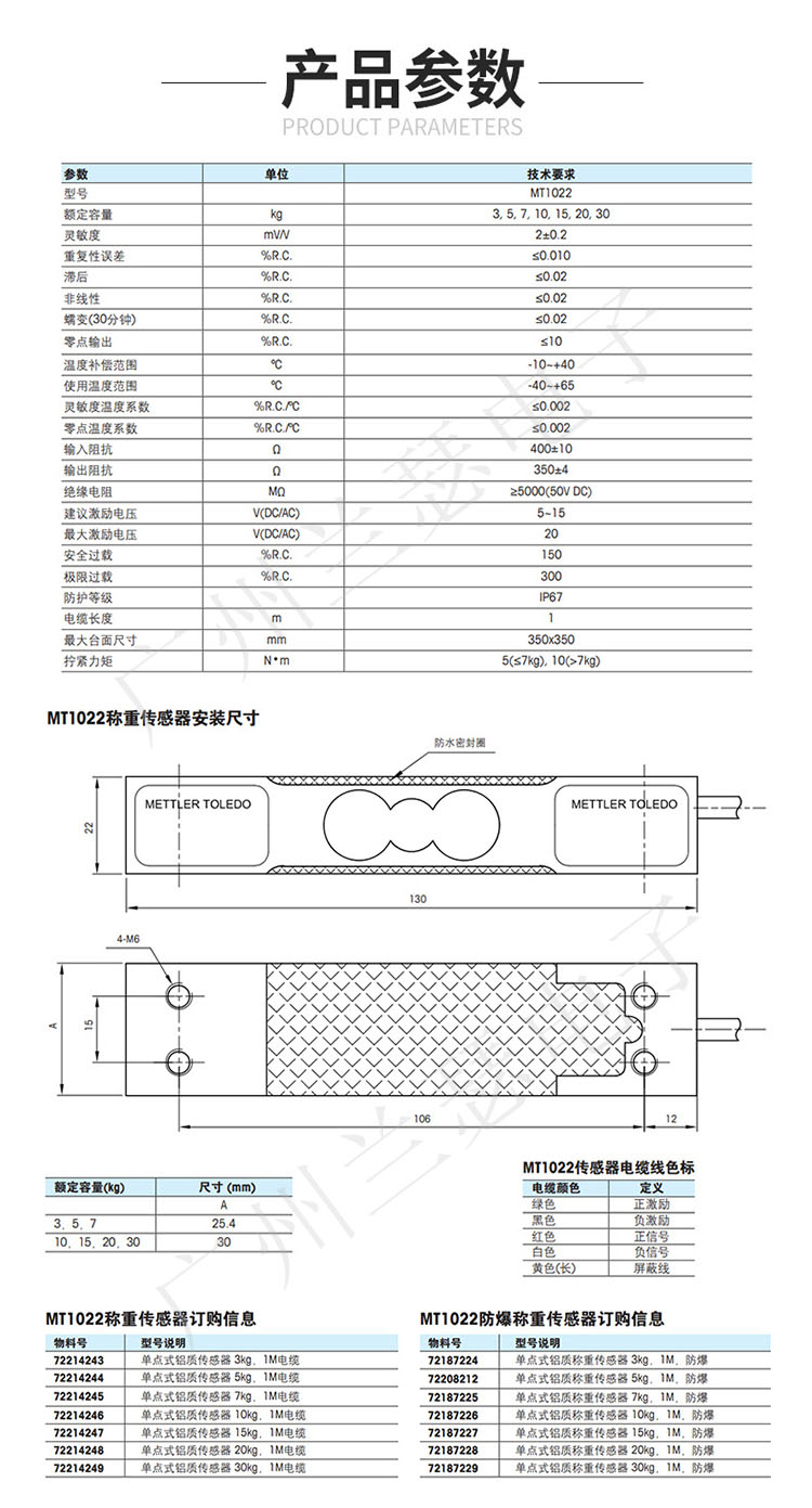 注:MT1022-3是梅特勒-托利多傳感器中容量為3kg,那么型號(hào)就是MT1022-3。以止類推得到MT1022系列的所有型號(hào),電纜線有1米和3米。