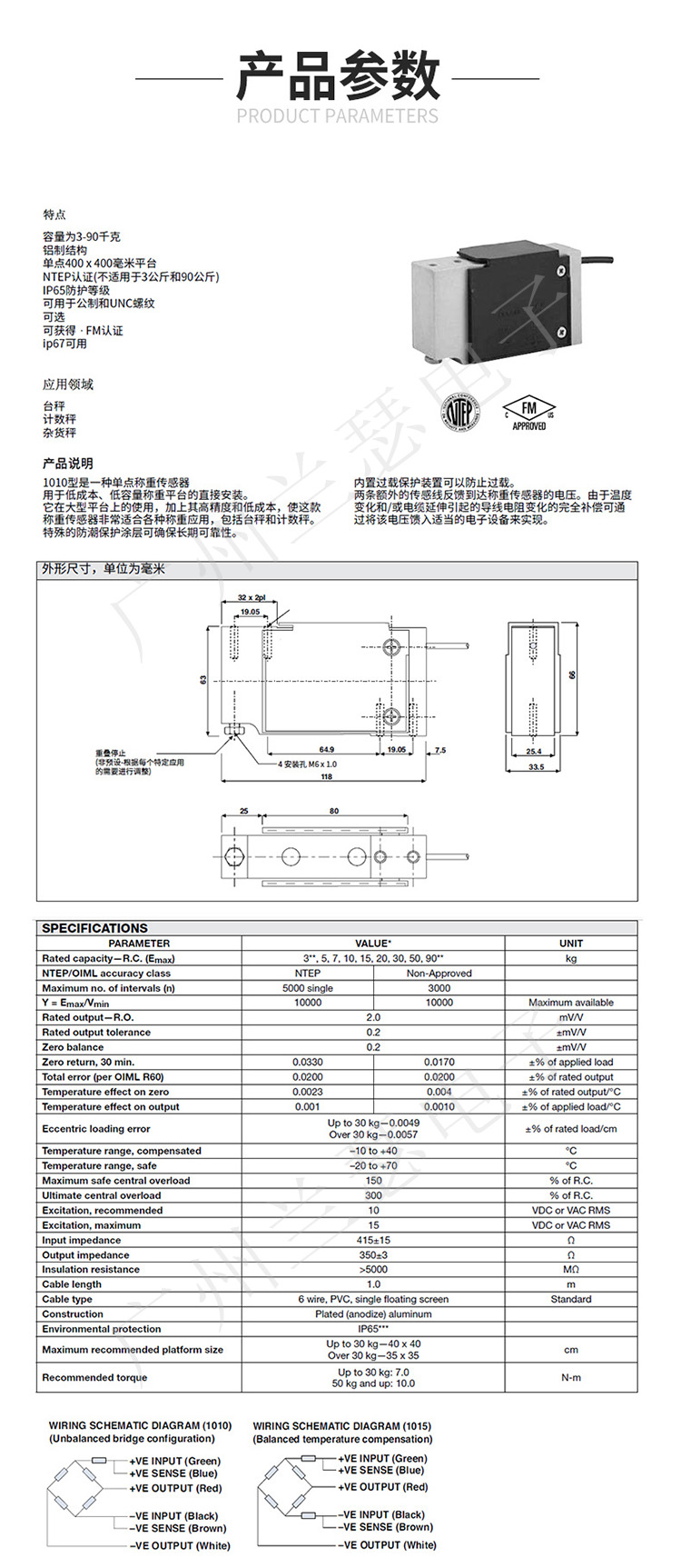 美國Tedea 1010-10kg稱重傳感器產(chǎn)品參數(shù):