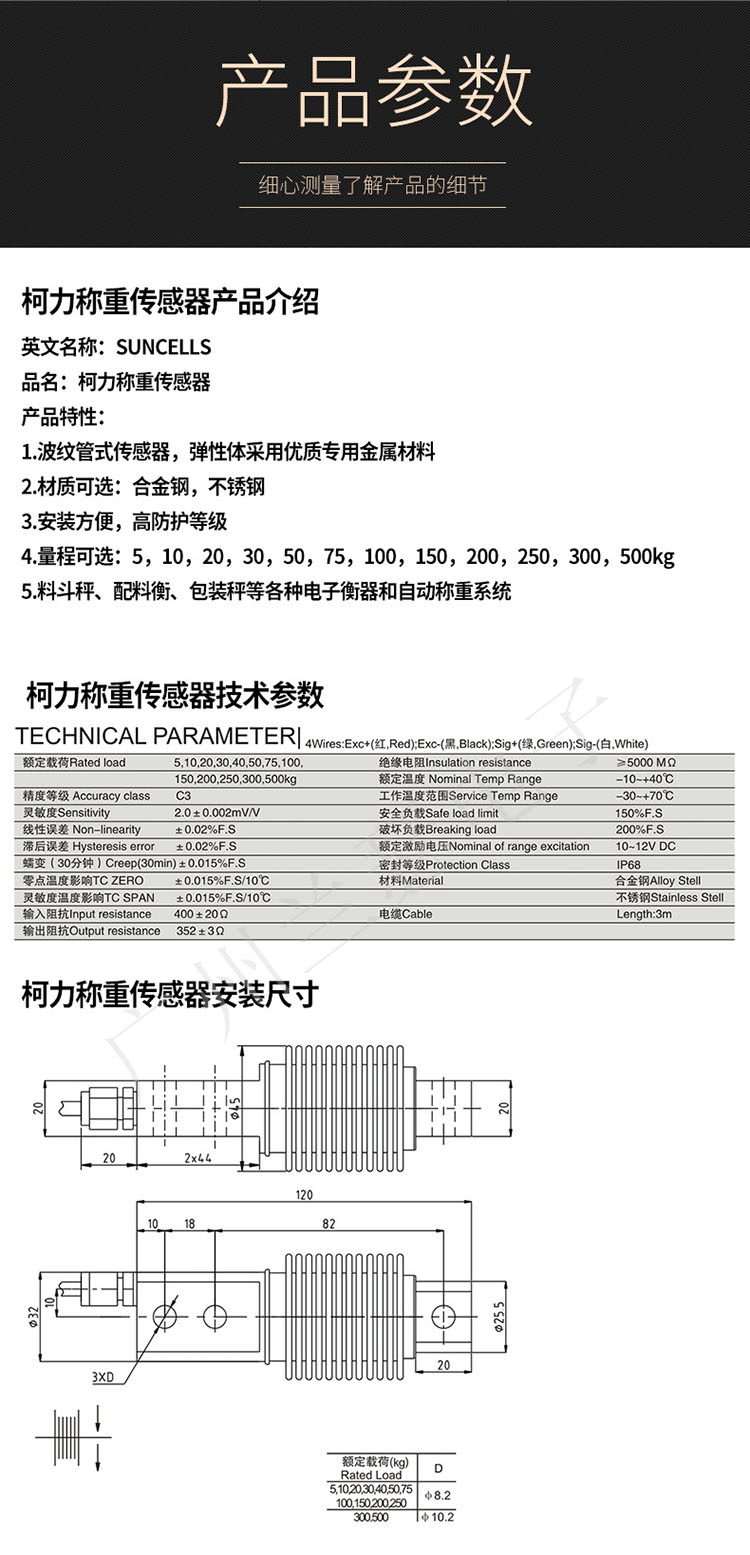 波紋管傳感器;優(yōu)質(zhì)合金鋼材質(zhì);安裝簡便、快速,高保護等級,穩(wěn)定可靠;適用于料斗秤、皮帶秤、配料系統(tǒng)等。