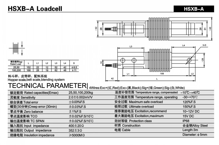 美國(guó)SUNCELLS HSXB-A-100KG稱重傳感器中文參數(shù):